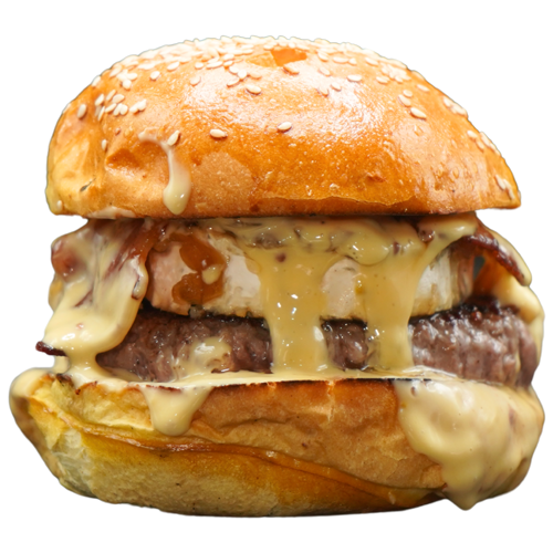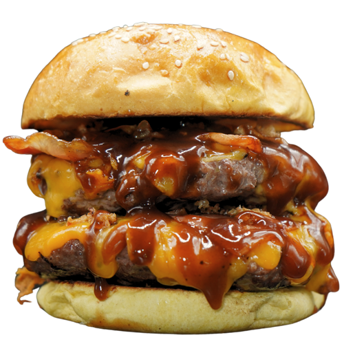 Pan brioche de mantequilla con sésamo, 300 gr. de ternera nacional smasheada, con doble queso cheddar americano, doble bacon ahumado premium, cebolla caramelizada y nuestra salsa BBQ.