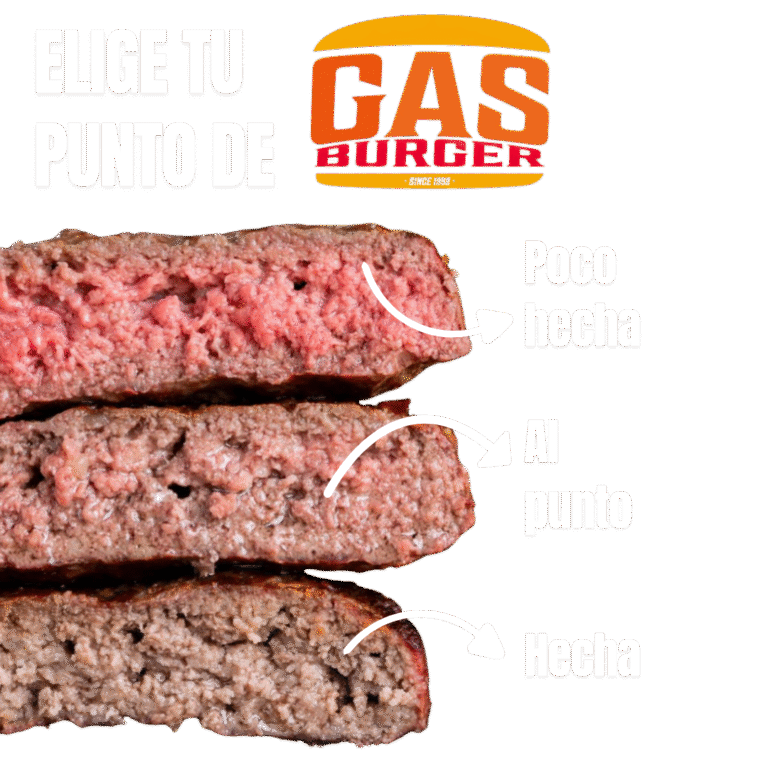 Pan brioche de mantequilla con sésamo, chuletón de vaca vieja madurada 50 días mínimo (160 gr.), con nuestro bacon ahumado premium, queso cheddar americano fundido, lechuga fresca, tomate, cebolla caramelizada, pepinillos y nuestra salsa especial Gas burger.
